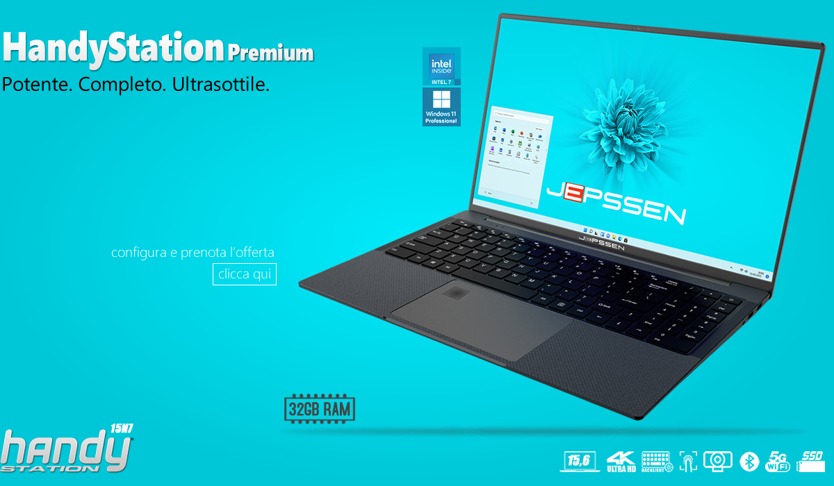 HandyStation Premium è un notebook con ampio display LED 1080p da 15,6" 16:9, progettato per offrire il perfetto equilibrio tra prestazioni, efficienza e versatilità.