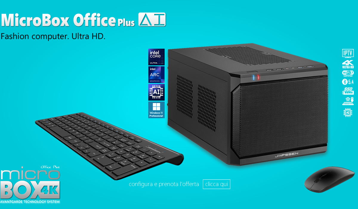 MicroBox Office AI Plus, nonostante le sue ridottissime dimensioni (22,5 x 18,0 x 38,8 cm), è davvero un "grande computer". Prestazioni al top, grazie all'impiego dei più potenti processori Intel oggi disponibili, lo rendono il prodotto ideale per qualunque esigenza di elaborazione o per qualsiasi soluzione di arredo.