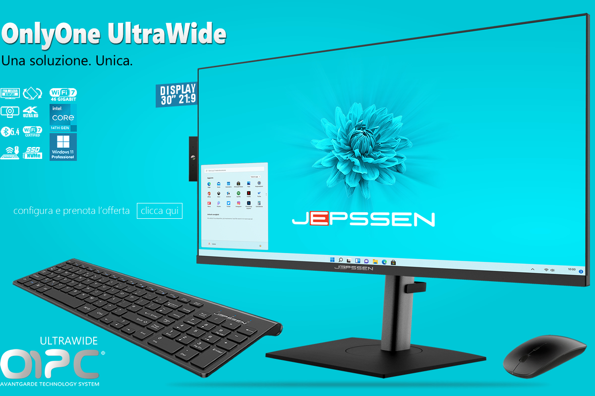 OnlyOne UltraWide è una "soluzione perfetta" per qualunque esigenza di elaborazione o per qualsiasi soluzione di arredo, perchè unisce la potenza di un grande computer, con prestazioni al top, grazie all'impiego dei più potenti processori Intel oggi disponibili, un display 30" LED 21:9 UltraWide, senza cornice (Frameless), di eccezionale qualità visiva, per l'assoluta fedeltà dei colori, della nitidezza e della luminosità ed un "look" particolarmente seducente e raffinato.