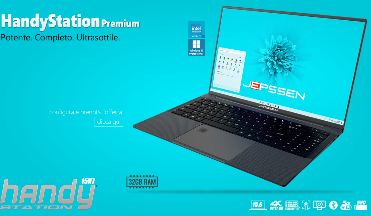 HandyStation Premium è un notebook dotato di un ampio display LED ad alta definizione Full HD da 15,6" 16:9 che unisce la potenza di elaborazione, grazie ai processori serie N-Intel 7 a basso consumo e alte prestazioni, appositamente dedicati alle soluzioni portatili, alla completezza della dotazione di serie, oggi indispensabile per un uso personale o lavorativo (smart working) e per la didattica a distanza (smart learning).