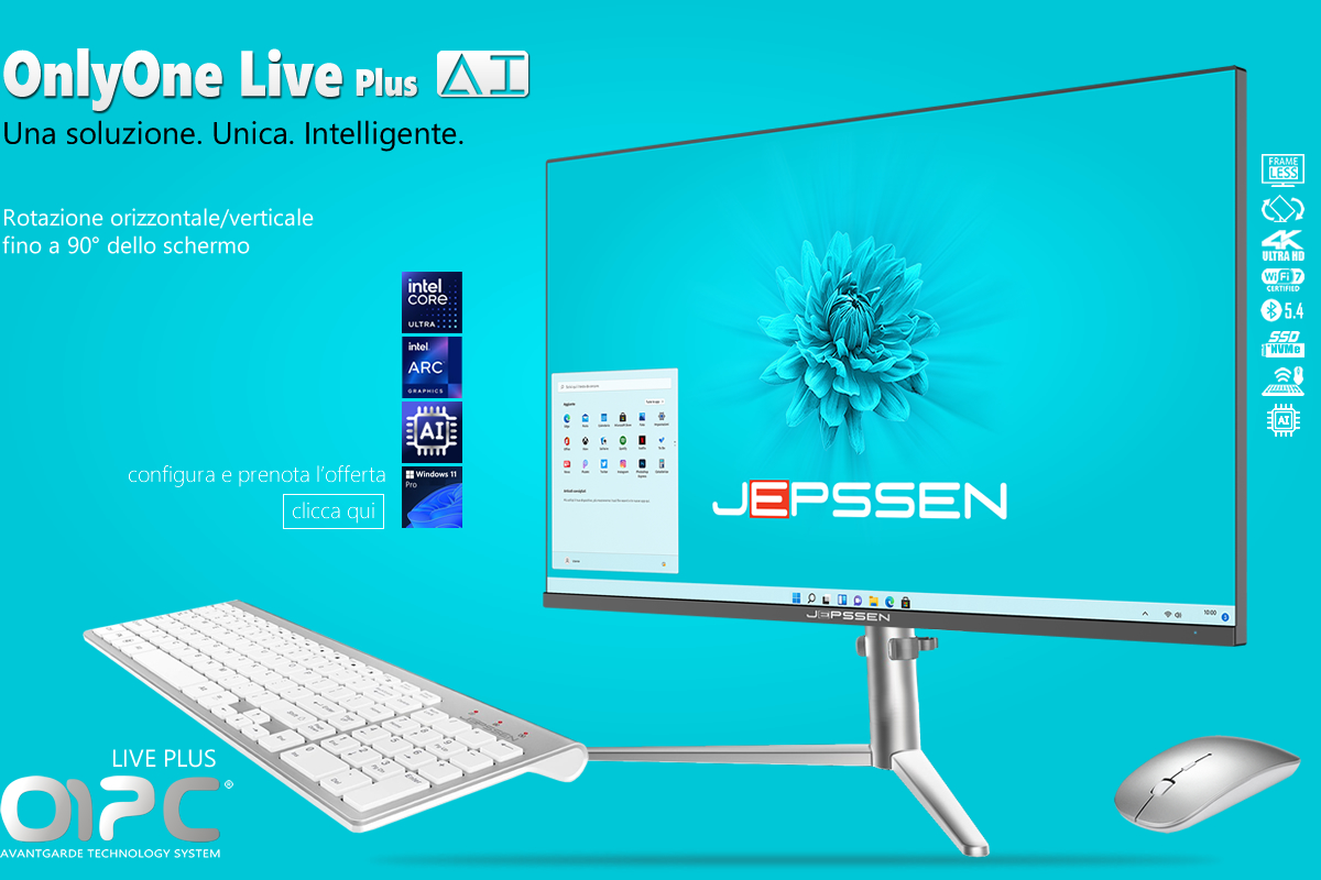 OnlyOne Live Plus rappresenta una soluzione ideale per qualsiasi esigenza di elaborazione e per ogni contesto d’arredo, unendo la potenza di un grande computer a prestazioni di altissimo livello. Grazie all’impiego dei più evoluti processori Intel attualmente disponibili, alle avanzate funzionalità di intelligenza artificiale e a un display LED 24" 1080p senza bordo (frameless), offre un’esperienza visiva straordinaria per fedeltà cromatica, nitidezza e luminosità, il tutto racchiuso in un design elegante, raffinato e seducente.