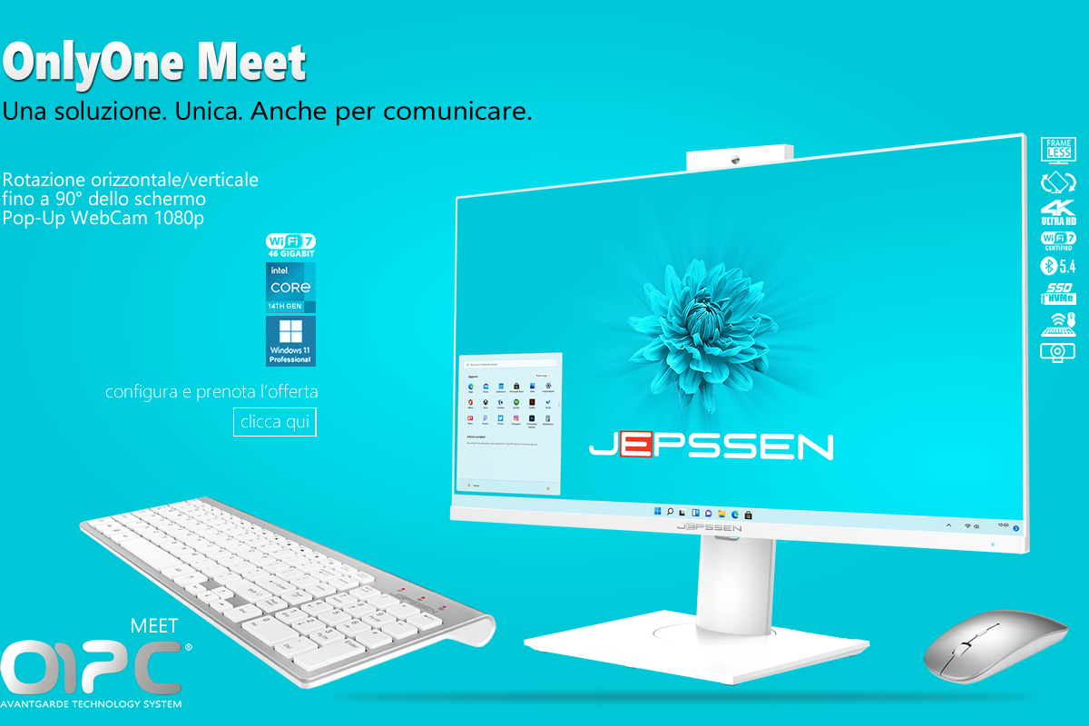 OnlyOne Meet è una "soluzione perfetta" per qualunque esigenza di elaborazione o per qualsiasi soluzione di arredo, perchè unisce la potenza di un grande computer, con prestazioni al top, grazie all'impiego dei più potenti processori Intel oggi disponibili, un display 24" LED Full HD 1080p, senza cornice (Frameless), di eccezionale qualità visiva, per l'assoluta fedeltà dei colori, della nitidezza e della luminosità ed un "look" particolarmente seducente e raffinato.