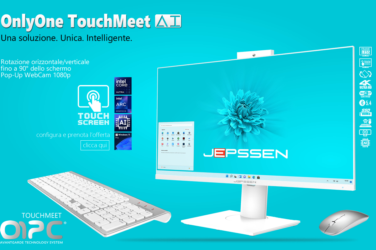 OnlyOne TouchMeet rappresenta una soluzione ideale per qualsiasi esigenza di elaborazione e per ogni contesto d’arredo, unendo la potenza di un grande computer a prestazioni di altissimo livello. Grazie all’impiego dei più evoluti processori Intel attualmente disponibili, alle avanzate funzionalità di intelligenza artificiale e a un display LED 24" 1080p senza bordo (frameless), offre un’esperienza visiva straordinaria per fedeltà cromatica, nitidezza e luminosità, il tutto racchiuso in un design elegante, raffinato e seducente.